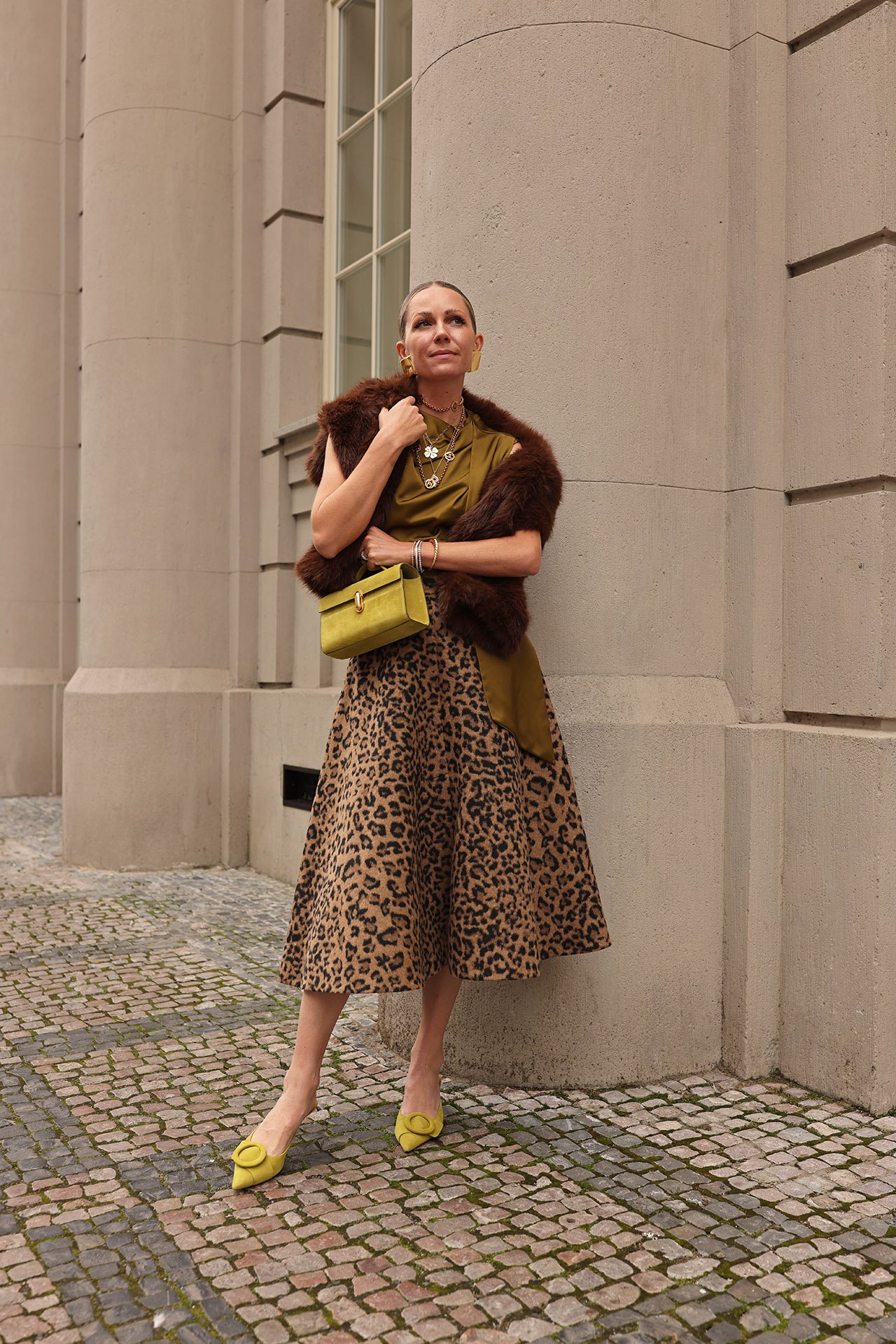 I had packed a few chartreuse pieces such as these shoes and this bag. I tried to get as much use out of them wearing them with this look and then again here with this ensemble. For a top I opted for this last minute purchase I have ended up loving and repurposed this fur pullover seen here as a shawl. As always I piled on ALL the jewels.