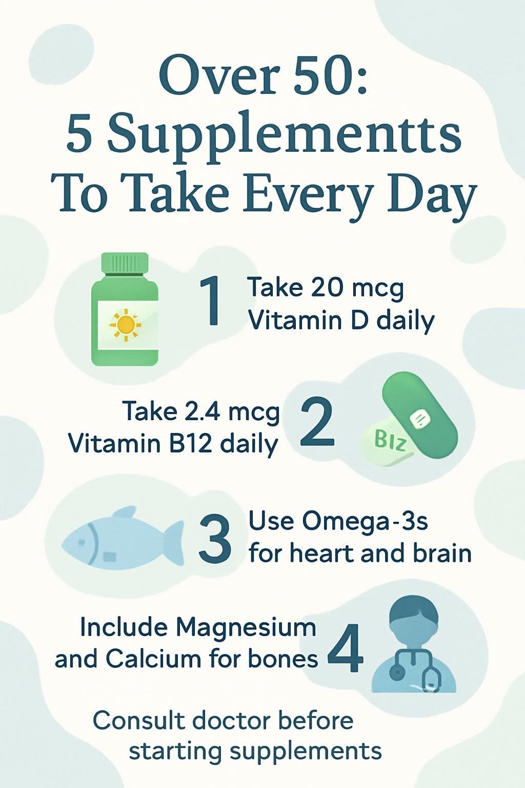 - Adults over 50 need key supplements like Vitamin D, B12, Omega-3s, Magnesium, and Calcium to fill nutritional gaps. These support bones, heart, brain health, and energy levels.